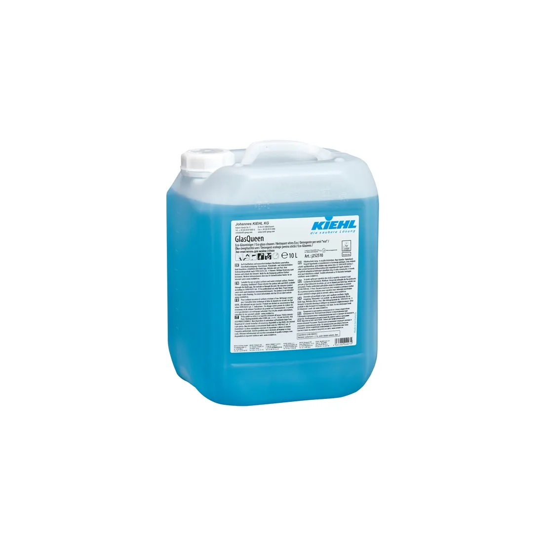 GlasQueen je připravený k použití výkonný čistič skla a vodovzdorných povrchů s certifikátem EU Ecolabel. Bez přidaných parfémů, bez klasifikace CLP. Tenzidy na bázi obnovitelných rostlinných surovin. Lahve ze 100% recyklovaného PET. Splňuje DIN EN ISO 22088-3 pro odolnost plastů — vhodný i pro citlivé plastové a akrylové povrchy.