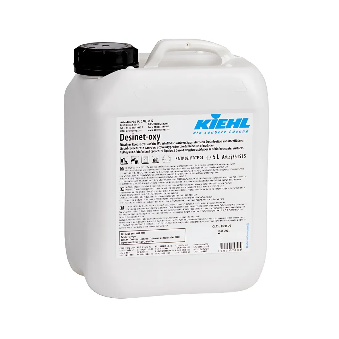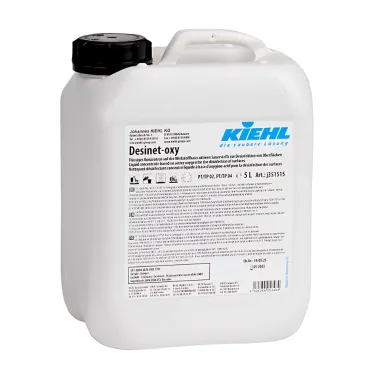 Desinet-oxy je kapalný dezinfekční čistič ploch na bázi aktivního kyslíku s mimořádně širokým wirkspektrem. Působí baktericidně, yeasticidně, virucidně (včetně non-obalených virů), sporicidně (C. difficile) a mykobaktericidně — vše v jednom přípravku. Je pachově neutrální, nezanechává toxická rezidua a vykazuje dobrou kompatibilitu s materiály včetně citlivých plastů jako akrylové sklo. Pro maximální účinnost je doporučena kombinace s přípravkem Clean@oxy. Plochy musí být před aplikací vizuálně čisté.