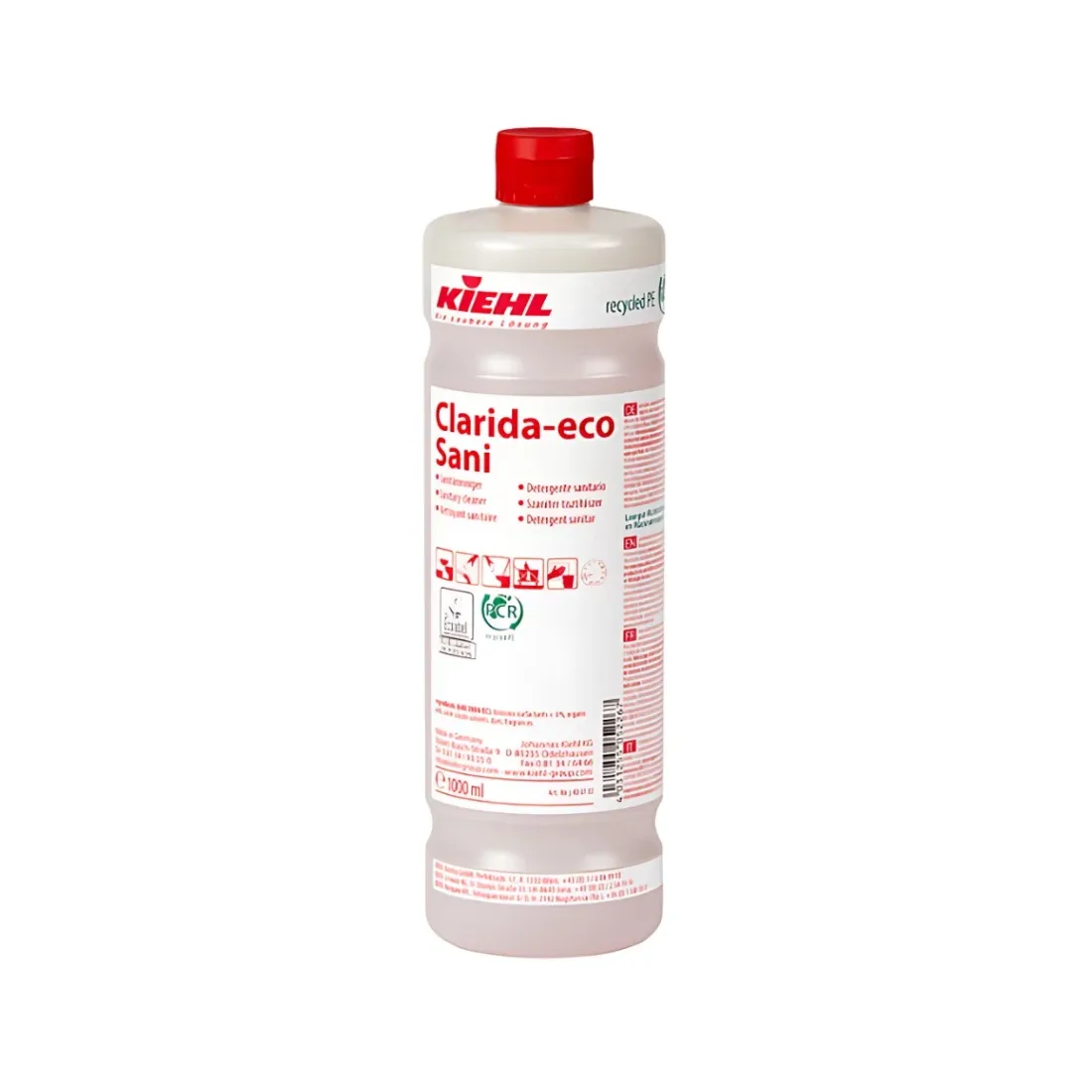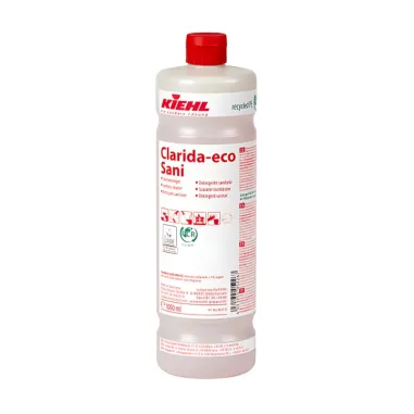 Clarida-eco Sani je aktivní sanitární čistič na bázi ekologicky šetrné kyselinové kombinace s obsahem obnovitelných surovin rostlinného původu. Přípravek spolehlivě odstraňuje vodní kámen, usazeniny mýdla a zbytky kosmetiky v celé mokré zóně — od keramiky a spár přes WC mísy, pisoáry až po armatury a sprchové kabiny. Díky certifikátu EU Ecolabel splňuje přísné environmentální požadavky Evropské unie. Při aplikaci příjemně voní svěží vůní, která nezatěžuje pracovní prostředí. Lahev je plnitelná z kanistrů větších balení.
