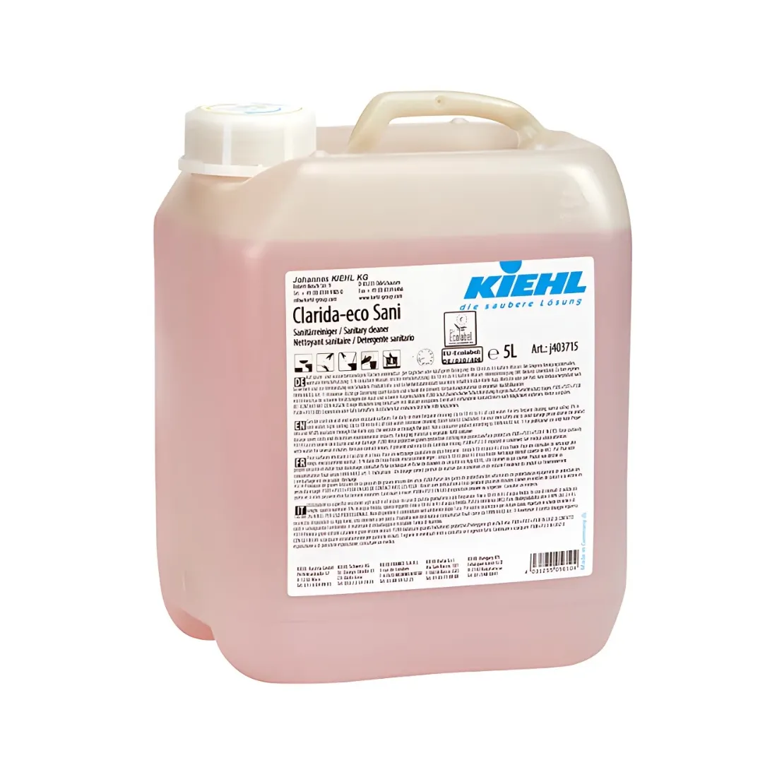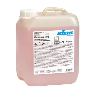 Clarida-eco Sani je aktivní sanitární čistič na bázi ekologicky šetrné kyselinové kombinace s obsahem obnovitelných surovin rostlinného původu. Přípravek spolehlivě odstraňuje vodní kámen, usazeniny mýdla a zbytky kosmetiky v celé mokré zóně — od keramiky a spár přes WC mísy, pisoáry až po armatury a sprchové kabiny. Díky certifikátu EU Ecolabel splňuje přísné environmentální požadavky Evropské unie. Kanister 5 l je ideálním ekonomickým balením pro doplňování lahví 1 l v provozu a snižuje množství plastového odpadu.