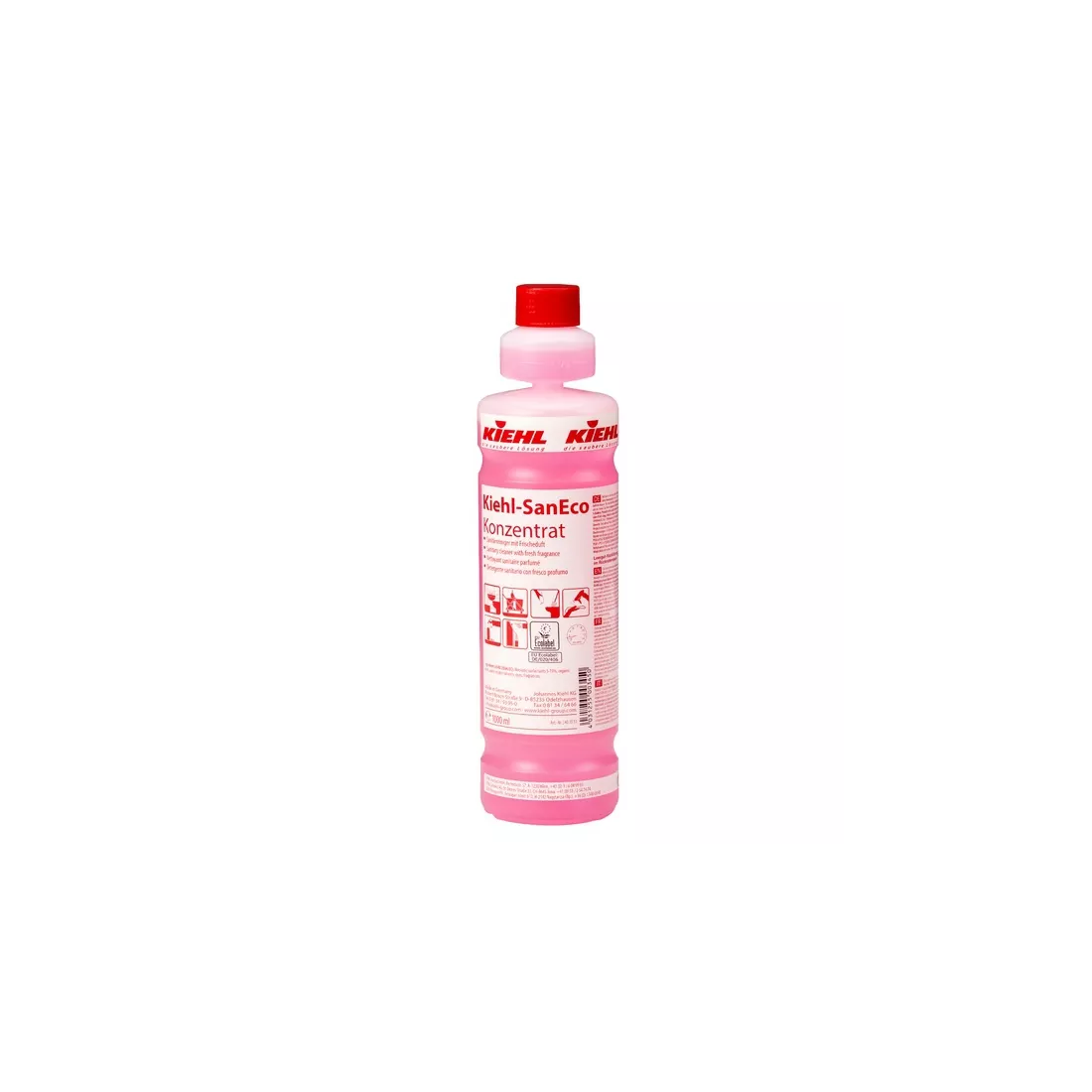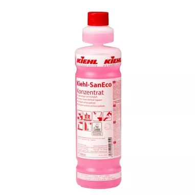 Kiehl-SanEco Concentrate je rychle účinkující sanitární čistič pro rutinní úklid na bázi kyseliny mléčné s EU Ecolabel. Odstraňuje vodní kámen, zbytky kosmetiky a mýdelné povlaky v celé mokré zóně. Pravidelné používání zabraňuje dalšímu usazování vodního kamene a zanechává povrchu vodoodpudivý efekt. Přípravek obsahuje obnovitelné suroviny rostlinného původu; tenzidy na bázi vegetálních surovin.